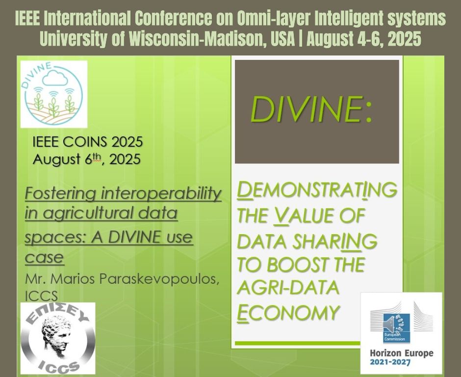 On August 6, Marios Paraskevopoulos from ICCS - NTUA, presented our work “Fostering interoperability in agricultural data spaces: A DIVINE use case”, co-authored with Ioanna Roussaki, at the IEEE International Conference on Omni-layer Intelligent Systems 2025, hosted by the University of Wisconsin-Madison in USA.